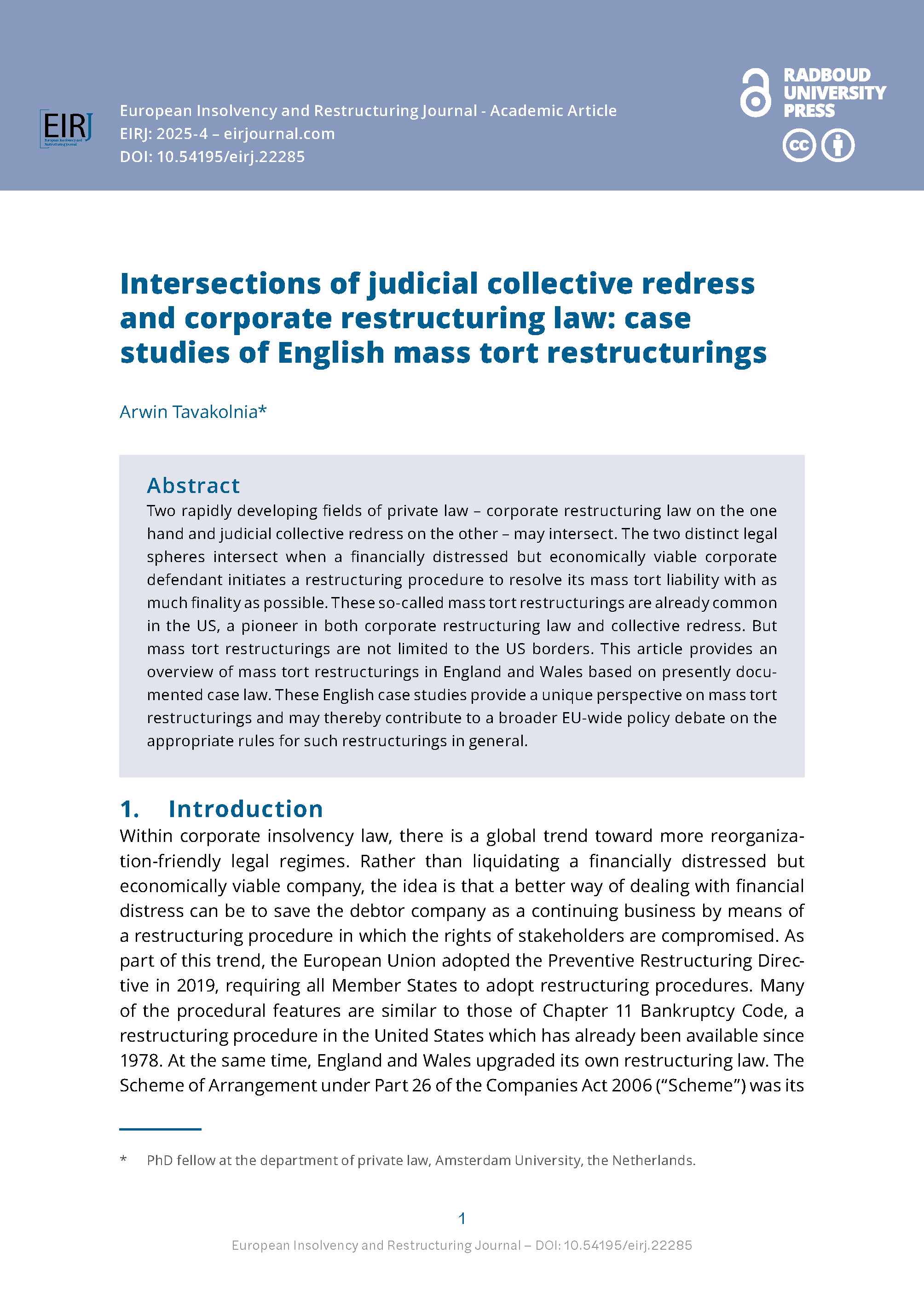 The European Insolvency and Restructuring Journal is a fully open access and double-blind peer reviewed journal focused on the development of insolvency and restructuring laws and practice in Europe.