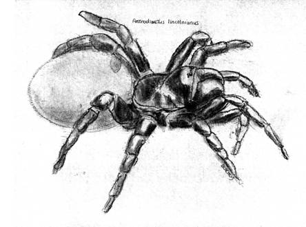 Like phantoms these burrowing spiders reappeared only sporadically, roughly at 30 year intervals, since the type specimens (all males) were described. A female was collected near Lincoln in the early 1950’s. On leap day, February 29 th , 1984, one crossed the sidewalk in front of arachnologist Hank Guarisco in Lawrence, Kansas. Most anyone else would have either stepped on it, or recoiled in horror. While they are members of the tarantula clan (mygal-omorpha), these spiders are not huge. Not all tarantulas are; one found only on the bald tops of the Great Smokey Mountains is no bigger than a flea. These Antrodiaetids can have an inch-long body like a good-sized wolf spider but with stockier builds. Their comparatively short legs are good for burrowing. Unlike a wolf spider, all eight eyes are tiny. The stout bases of the fangs project forward, rather than down, a mygalomorph trait. Their shiny exoskeleton is the color of chestnuts, except the abdomen which looks like a tiny, fuzzy Kiwi fruit. On the soft abdomen, just behind the narrow pedicel are two shields of black, hardened chitin. See this archaic characteristic, and you know it is Antrodiaetus.