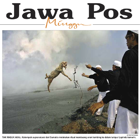 Published on the front page of the Sunday edition of the Jawa Pos, Indonesia’s most-widely circulated newspaper, on November 5, 2006, the image of the goat sacrifice — the animal flying into a pool of hot mud — accompanied a long article about local factories’ financial losses caused by Indonesia’s infamous mud volcano, commonly known as the “Lapindo” mudflow, after Lapindo Brantas, a gas exploration company drilling at the disaster site (Figure 1).2 In addition to the dramatic economic losses facing residents and factories in the area, this giant, uncontrollable geyser of mud has swallowed the homes of approximately 40,000 people in the Sidoarjo district of East Java. The four final sentences of the article, set off with a “Meanwhile. . .” to signal the transition, have no substantive connection to the factory losses and serve only to contextualize the image of the goat. By mentioning the arrival of mystics who performed several sacrifices to appeal to supernatural forces to stop the mudflow, these sentences justify the presence of the photo of the goat’s spectacular death, which overwhelms this and other stories in the paper through its powers of attraction and provocation.