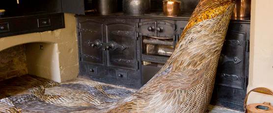 As we enter the kitchen we are still in the downstairs of the house, and we are in for another surprise. Where there should be reminders of meat roasting over the fire, bread being kneaded and vegetables chopped on the worn and scrubbed surface of the kitchen table, game hanging in the game cupboard, all that wonderful Downton Abbey warmth and order, we are confronted with the luxuriousness and rich decorative beauty of game-bird feathers flowing in an exquisite river from one of the shining copper pots on the stove, like the magnificent and exotic tail of a peacock