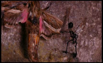 The fairies have weapons and tools made out of bones. For example, one fairy hammers a pin through a moth carcass using a tiny bone. Moths and butterflies are pinned to walls by the fairies for decoration. But later in the video we see the butterflies and moths pinned to the walls still flapping their wings. In this the video helps evoke an image of real cruelty.