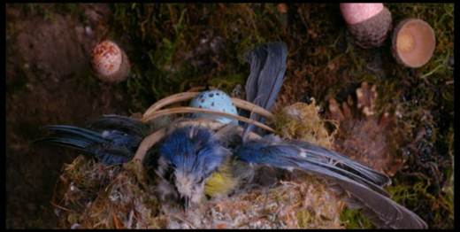Beauty and color come from the moths and butterflies murderously pinned with their delicate wings flapping, from birds ingenuously imprisoned on their nests as egg producers by the ribcages of other creatures that the fairies have killed, from their delicate eggs and the soft green moss. The film provokes because it shows endeavor without reflection, building without thinking a place in which it is hard to dwell, to inhabit. As the film draws to a close the color is drained out. What we see in the little black, winged fairies is an image of human industry, invention, and productivity, where what gets made is a dry and desiccated world of bones, and sand, and dust. Beauty is entrapped in modes of production: what get created are the bare bones of existence — not a place to dwell.