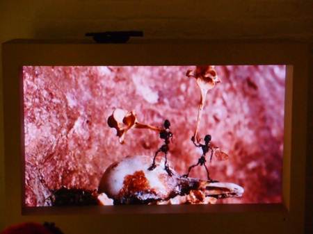“Den of Iniquity” is a short video revealing the industrious activities of what the artist calls her fairy species. All the elements of the video — the fairies and the other creatures depicted — are made up of bits and pieces of debris and dead insects the artist has collected. The video shows the fairies dragging their latest prey, the carcass of a dead rat — back to their home, where they string it up by its feet, like any other dead carcass in an abattoir or game cupboard. The video shows the fairies’ different technologies and industries. For example, there is a honeycomb with bees trying to escape from their cells, and birds on nests laying eggs that roll down a fairy-made chute.