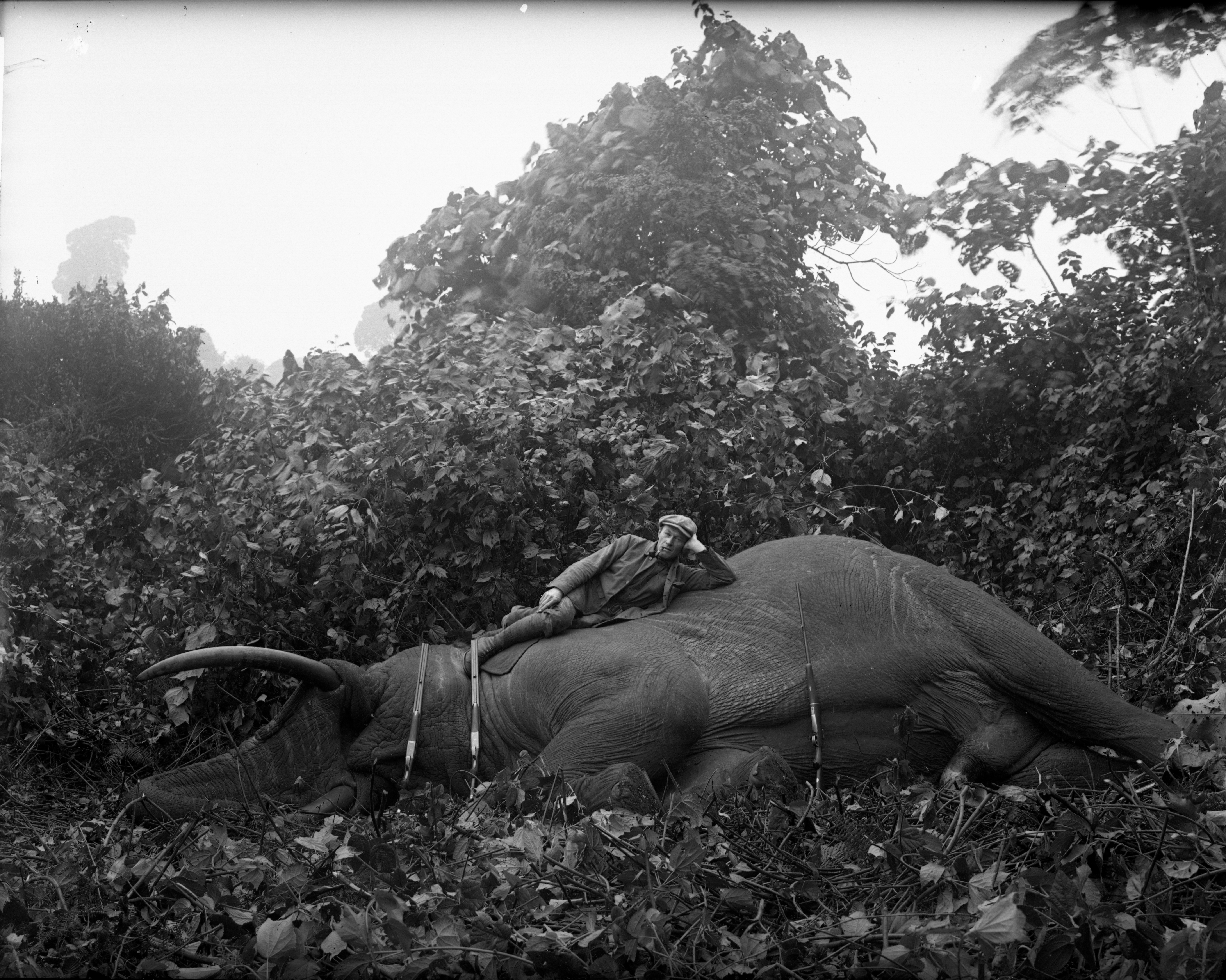 Figure 5: Carl reclining on the bull elephant he killed on September 6, 1910, on the AMNH expedition. The specimen was not saved. Image # 240928, American Museum of Natural History Library.