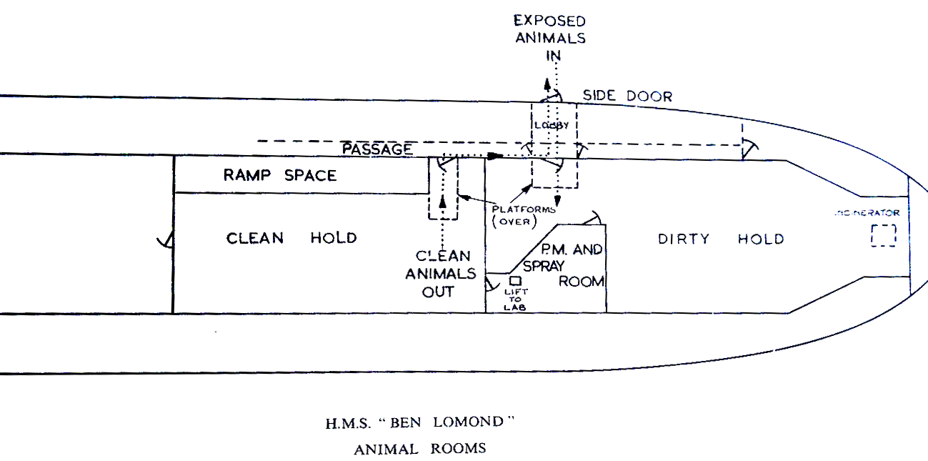 After exposure to a toxic agent, all animals from the trials were held in the dirty hold of Ben Lomond for observation. When the results of the assessment of infectivity were calculated, those animals that were not infected were killed immediately; they were deemed useless. Those that were infected did, however, have a value — but this was mainly after the scientists had killed them and given a post-mortem examination.