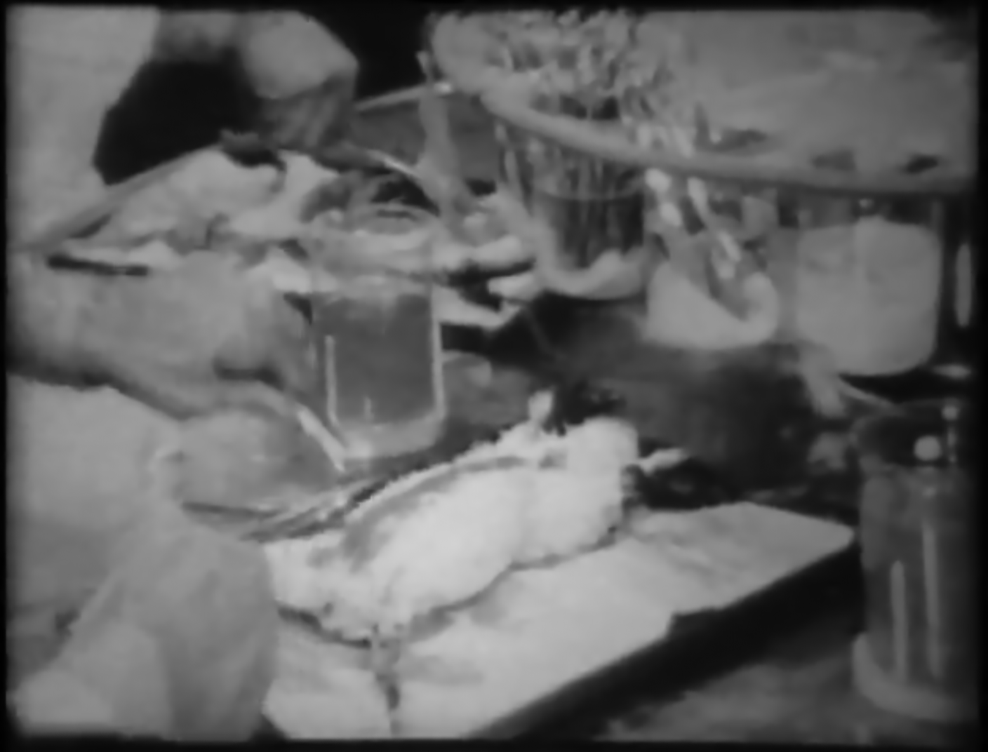 Figure 3: The “Travelling Circus”: Rotating postmortem table and vivisected guinea pig. Still from the instructional film Operation Cauldron 1952, directed by J. D. Morton.