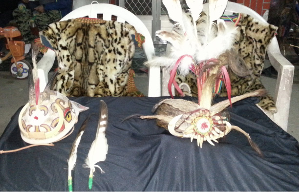 Figure 5: On the chairs, two vests made from synthetic leopard furs. On the table, a headdress of boar fur and a helmet made from muntjac leather, and in the front two hawk-eagle feathers. Pingtung county, 2019. Photographs by the author.