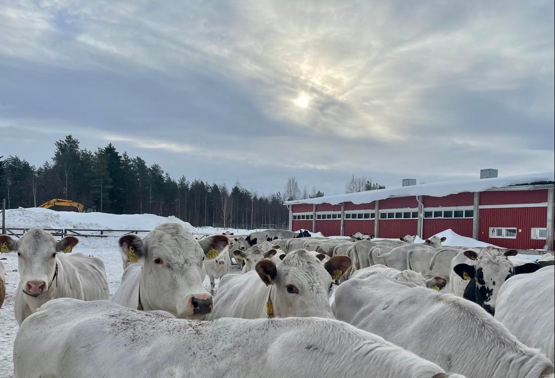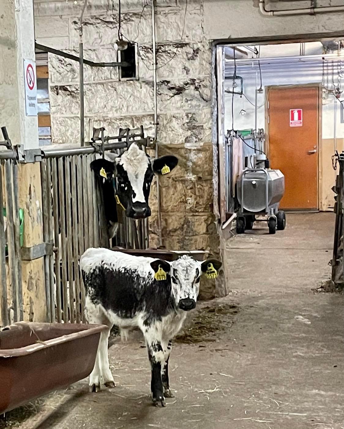 Figure 4: Uuno (the calf) follows us around and visits the other cows in the barn. Photo taken by Mervi Honkatukia, February 2022.