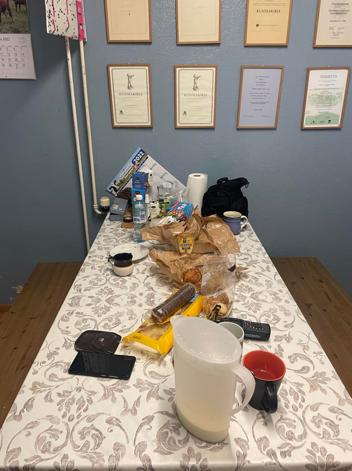 “Welcome to prison,” the supervisor says when our team of researchers first arrives on a cold February morning. In this white snowy landscape, where it is difficult to see where the road begins and ends, the supervisor’s big, warm smile stands out in contrast to the cold climate. “Finnish native breeds” the sign on the outside door reads, featuring a photo of a cow with her calf. Walking into the corridor, a cosy little dining area and office are located on the right-hand side. Here, what appears as a never-ending supply of coffee and cake await (see fig. 3). Across from this room, we find the changing area where the two supervisors and all guests get dressed. The walls are adorned with posters and drawings by the inmates: one poster shows the eight dam lines that have been housed at the prison farm, while a Christmas card (drawn by one of the inmates) along with a range of cattle awards are featured as well (see fig. 3). In the changing room, we put on big rubber boots, overalls, gloves, and a hat — not only to protect us from the freezing cold, but also to help shield us from the smell, the cow dung, and the mud.