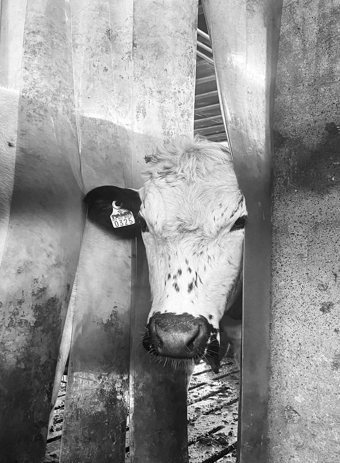 In this working environment, inmates and supervisors attend to various farm chores: cleaning the inside areas, attending to the cattle, feeding, and milking them, while also helping the young ones latch on to large artificial nipples that have come to constitute their source of nourishment. With the radio blasting (music and programming are chosen by the inmates), the atmosphere is decidedly laid-back, and everyone appears to be focused on their work. Inmates move around the barn, cleaning, laughing, talking to each other — and, importantly, always also to the cows. As a team, we join the inmates and cattle, brushing the cows, milking, and walking with them. The cows appear content and often playful, especially the younger ones. Cows move to and from the milking station (fig. 5). Inmates make coffee, and everyone seems occupied with performing specific tasks. Much in the same manner as the inmates, cows appear adjusted to the daily routines, including going into the milking station as well as, in the summertime, going on a twice-daily walk to a nearby green pasture. The inmates tell us that despite the smell and the risk of injury when in the company of large animals, working at the living gene bank is highly desirable work.