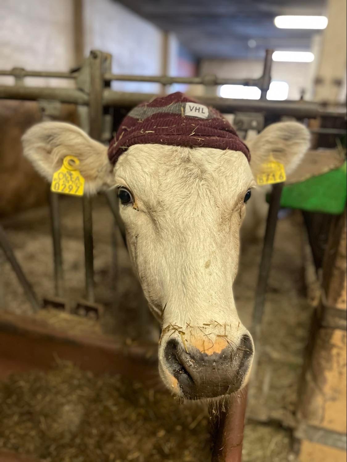Figure 6: Photo of the cow Olea wearing a care-worker’s hat. Photo taken by Mervi Honkatukia, February 2022.