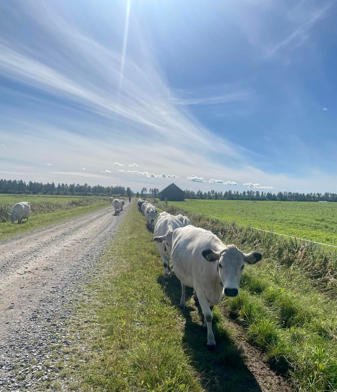 Figure 7: Late summer walk with Northern Finncattle from their pasture back to the living gene bank. Photo taken by Charlotte Kroløkke, August 2022