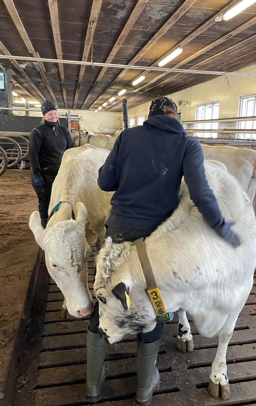 Figure 8: Interaction between supervisors and cows. Photo taken by Mervi Honkatukia, February 2022.