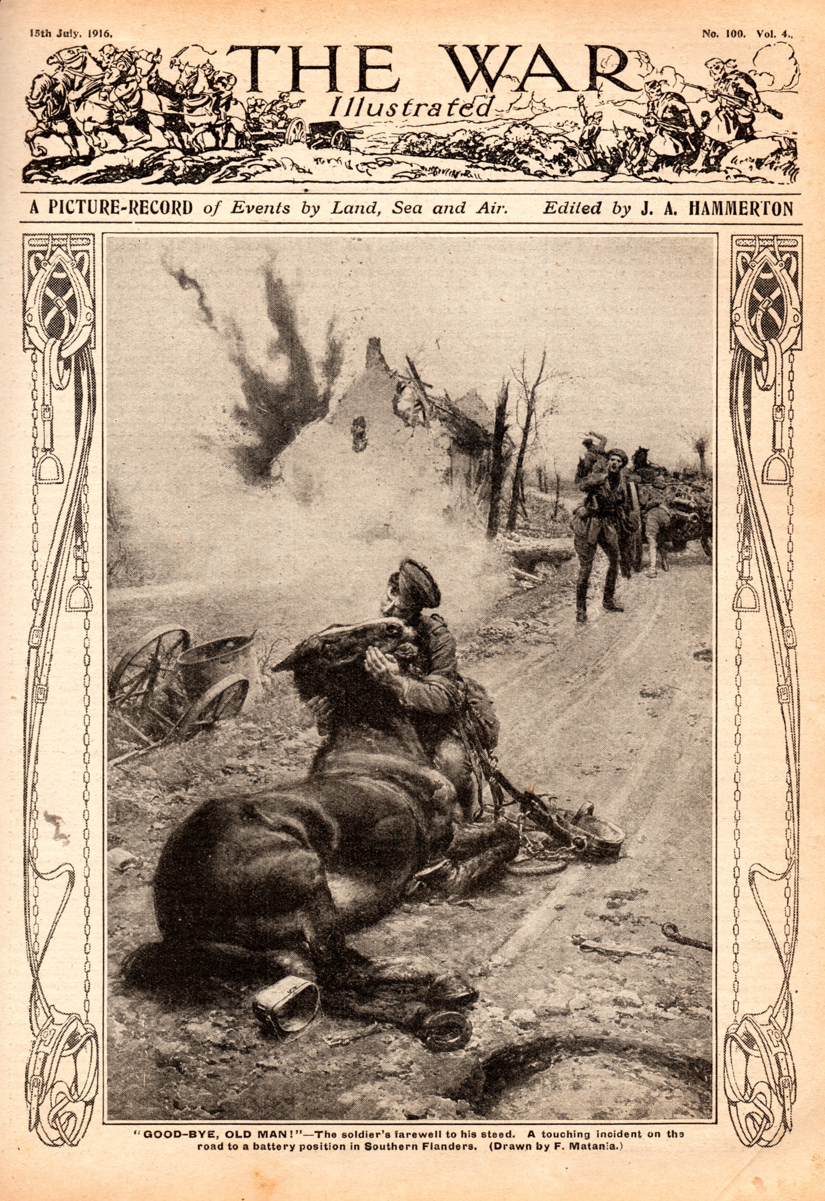 On 15 July 1916, The War Illustrated led its one hundredth edition with a front-page illustration entitled “‘Good-bye Old Man!’ — The Soldier’s Farewell to His Steed. A Touching Incident on the Road to a Battery Position in Southern Flanders” (fig. 1). Published when British forces on the Western Front were fighting in the succession of battles that would later be remembered collectively as The Somme, it told the story of a young artilleryman whose horse had been mortally wounded. Although torn by the urgency of the situation, and the shouts of his comrades, the soldier knelt with the dying horse’s head cradled in his arms. With the horse’s harness removed and hitched over his shoulder, he wept as he said a hurried last goodbye to his faithful friend.