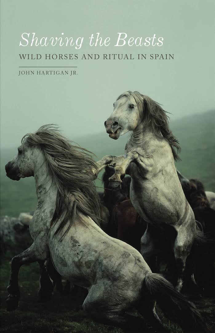 I first encountered the research project that grew into this book when it was an early work in progress. The author, John Hartigan Jr., was a generous mentor during my graduate studies, and in that spirit he invited me along to a seminar discussion and workshop of his project proposal — one that was mutually exciting, in that he was also looking for “horse people” to help him shape his approach to studying the sociality of horses during a festival called a rapa des bestas (“shaving the beasts”). This summertime practice unfolds in the mountains of Galicia, wherein several hundred wild-living horses are driven down from the mountains into enclosures, or curros, where the hair from their manes and tails is shaved off and male foals are culled from the herd. After a matter of an afternoon or a matter of days, depending on the town holding the rapa, the shaved horses are released back into the mountains. Hartigan had attended this event as an interested spectator the prior summer, and had decided to go on to develop a full ethnographic study of the horses during the following summer’s event. Hartigan’s work-in-progress presentation included a number of photos of the event he had visited, showing hundreds of horses who normally live very unenclosed lives penned up into a small corral and surrounded by rowdy human spectators. So, seated at a seminar table with a very illustrious and (to me!) intimidating set of senior scholars debating the ins and outs of new forms of multispecies ethnography emerging in the mid-2010s, the only confident footing I had at this moment was grounded in the “horse person” side of me.