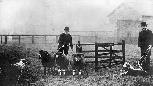 Whatever their looks, the dogs’ preferred herding behaviour was clearly defined by 1900, and so were the shepherd’s demeanour and interaction with his dog. In its first decades, I would suggest, trialling — a male-only sport in the nineteenth century — underwent a stylization that had clear overtones of Victorian middle class and genteel ideals of manliness.79 Appropriate manly behaviour was based on restraint and self-control and did not allow for outward displays of excitement, nor for raising one’s voice or wild gesticulation. Dominance should be embodied in and flow naturally from posture and gaze: the judges rewarded natural authority and quiet command, of the shepherd over the dog, and of the dog over the sheep. Thus, the improvement of shepherding, the stated objective of the genteel organizers of the trials, amounted to the shepherds and their dogs emulating the norms of conduct of their patrons. The remarkably formal attire of the shepherds at the trials, illustrated in the photo (fig. 6) below, supports this interpretation.