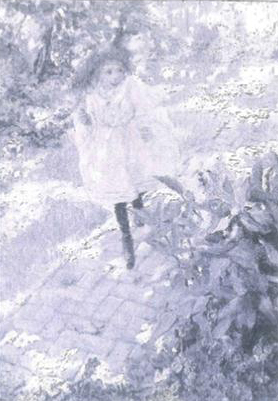 To underscore this point in her humane narratives, Phelps calls attention to the liminal sites between the home and the streets. In Trixy, for example, a dog-bandit abducts Trixy from the open area just outside of Dan’s tenement building. In “Tammyshanty,” the dognapper takes the even bolder step of breaching Jacket’s living quarters (presumably nabbing Tammyshanty through a broken window). Describing Jacket’s frantic search of his tenement, Phelps emphasizes the porosity of domestic space. Snow drifting through shattered windows suggests the utter violability of the home structure. Tammyshanty’s vulnerability to abduction is compounded by the fact that he spends the majority of his time sitting at broken windows, reposing on the tenement stoop, and patrolling the alleys surrounding his home. Windows, doorways, and stoops are conspicuous features of the urban architecture in all of Phelps’s antivivisection works. Her canine characters and their human caretakers spend an inordinate amount of time gazing through, sitting at, and lingering near these liminal sites. The color illustrations in Loveliness suggest the importance of these spaces in Phelps’s narrative landscape. With the exception of the story’s frontispiece (a portrait of Loveliness), its illustrations all depict characters in liminal positions: Adah keeping vigil at her windowseat, a dognapper stealing Loveliness from his family’s doorstep, and Adah and Loveliness skipping down a path in their yard (Figures 2, 3, 4).