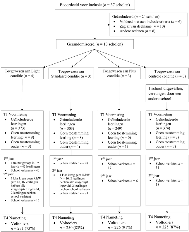 De huidige studie had als doel om te onderzoeken of 1) de schoolinterventie Rots en Water (R&W) effectief was in het verbeteren van competenties en voorkomen van problemen in het intra- en interpersoonlijk domein van leerlingen op het voorbereidend middelbaar beroepsonderwijs (vmbo), en of 2) interventie-effecten veranderden naarmate er meer mensen betrokken waren bij de interventie (kernteam van leerkrachten, het hele schoolteam, het hele schoolteam en ouders). We hebben een gerandomiseerde gecontroleerde studie uitgevoerd onder brugklassers (N = 1299; Mleeftijd = 12,38; 54 % jongens) die vier keer digitale vragenlijsten hebben ingevuld. De resultaten lieten zien dat R&W een aantal interventie-specifieke uitkomsten (zelfcontrole en emotionele zelfregulatie), uitkomsten in het intrapersoonlijk domein (psychologisch welzijn, seksuele autonomie en internaliserend gedrag) en in het interpersoonlijk domein (agressie) verbeterde, maar uitsluitend wanneer een kernteam van leerkrachten betrokken was bij de implementatie van de interventie. De (gematigde) interventie-effecten waren het grootste in het eerste jaar van de tweejarige interventie. Deze resultaten laten zien dat R&W positieve effecten kan bewerkstelligen bij vmbo-leerlingen wanneer deze geïmplementeerd wordt door een kernteam. Het lijkt dus waardevol voor scholen om te investeren in interventies met een leerstijl die aansluit bij die van de doelgroep, met een hoge kwaliteit van implementatie en een beperkt aantal betrokken personen.