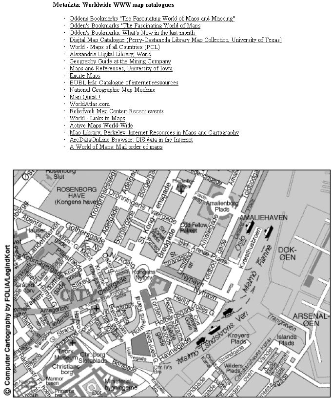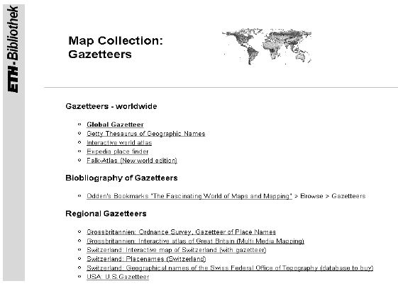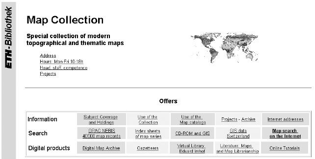 On the other hand, we can profit from the work of our colleagues, for example by copying their index sheets or lists, selecting links from their Web sites or by consulting them. Communication between colleagues is helpful in developing and maintaining a useful Web site. The ETH-Bibliothek map site can illustrate some of the possible map services on the Internet.