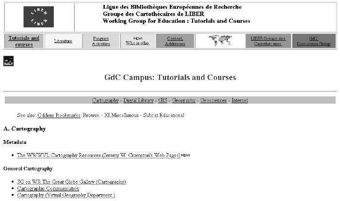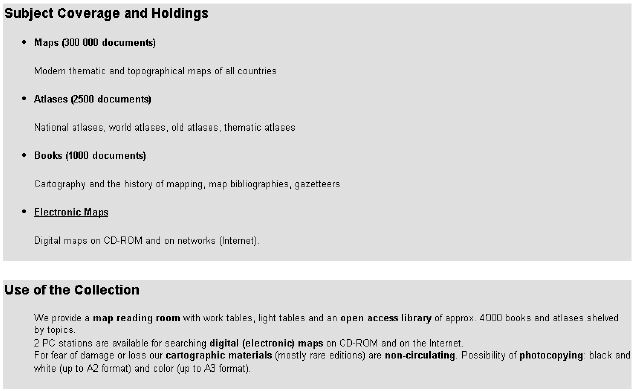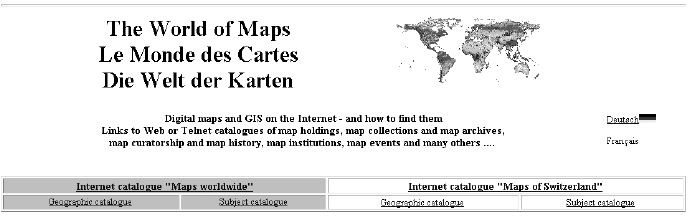 It contains a geographical and a thematic map catalogue with metadata and digital maps, and numerous links to Web pages in cartography and map librarianship: