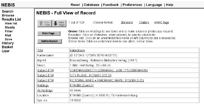 NEBIS comprises over 60 libraries. It contains holdings of the map series and atlases as well as the monographs in the ETH map collection. In NEBIS there are 40,000 records representing 300,000 maps.