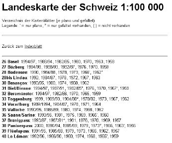 Sheets of the map series are not recorded in NEBIS-WebOPAC. To find specific map sheets you have to go to the index of a map series. Once a map series is displayed, you can click on the index map to select the desired sheet number, and you can see a list of sheets with different editions. Wolfgang Crom (Berlin) presented this idea on a workshop in January 1999, which is easy to reproduce and also convenient for small map collections (see also Crom, 1999).