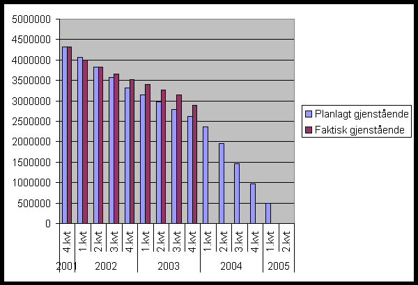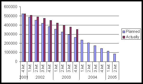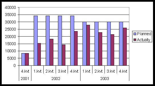 What remains is partly to work through the backlog incurred during the move to the temporary site and to complete the rest before June 2004. The backlog is estimated to approximately five man-years and the rest of the planned production is estimated to 23 man-years. Figure 3: Number of items converted quarterly. Figure 4: Total production of conversion quarterly.