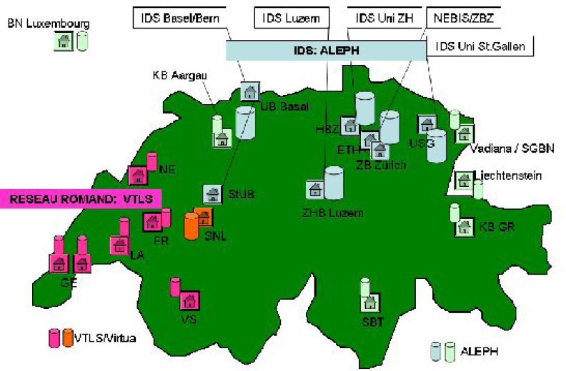 The IDS is a fairly recent construct: Directors' meetings started in 1994, as KDH (Konferenz der Deutschschweizer Hochschulbibliotheken). In 1996 it became clear that all members had to find a new library management system, and it was decided to evaluate together, with the aim of close cooperation on various levels and beyond simply using the same technology. In 1997 the collective decision was taken to adopt Aleph - this was a first proof of cooperative synergy: it was possible to conduct an in-depth evaluation within year by pooling the IT-specialists of the 7 libraries. At the same time, we decided to adopt US-MARC as a basic underlying format and adopt new cataloguing rules on the basis of AACR2. In 1998, the contract with ExLibris was signed, and the implementation process started. Autumn 1999 saw the switch to production with the new LMS in all 7 libraries, another major proof of cooperative synergy: it took us only one year to convert several old databases (using four different LMSs!) to one new system with a common set of parameters and look-alike OPACs for all libraries, based on one MARC format.