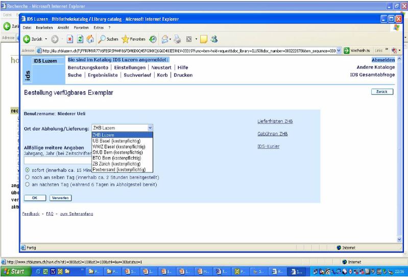 But while the SUF in itself has been quite a success within the IDS libraries and for their users, it turned out to be an ideal basis for another service that has proved to be very attractive: the IDS-wide pick-up service. It was introduced in January 2005 with 4 participating libraries (Basel, Bern, Lucerne, and the Zentralbibliothek in Zürich); in April 2006, a 5th library will join the scheme (St. Gallen). It allows a user to order a book directly from the catalogue of each participating library and to determine the place of its delivery. Having finished with the book, he can give it back in any of the participating libraries (see Figure 4).