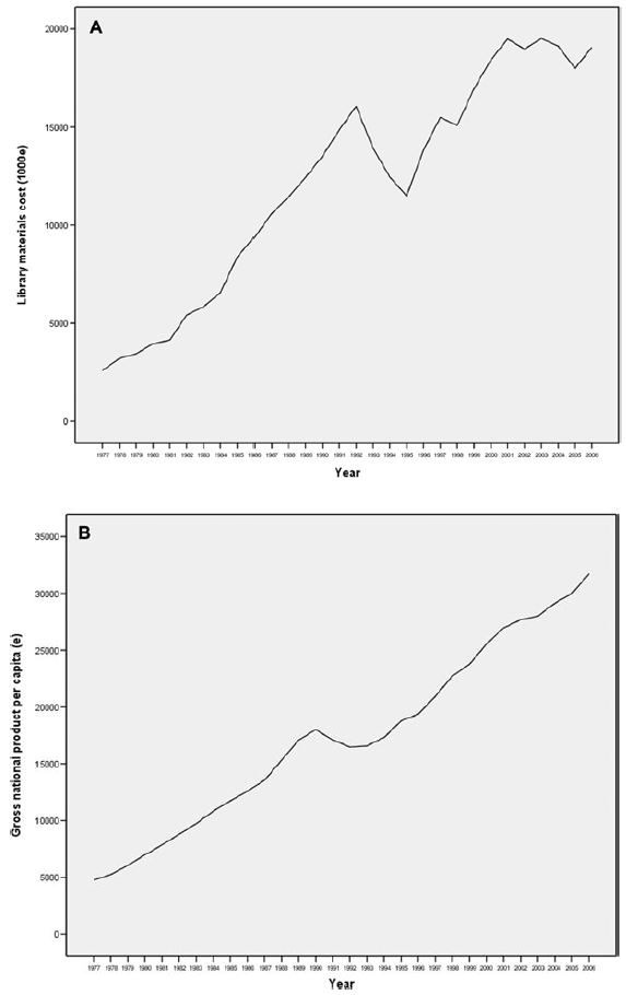 Figure 1 shows the trend of the GNP and and the trend of library materials expenditure in the period 1977–2006. The recession caused by the economic depression of the early 1990s is clearly seen both in the GNP and in the library materials expenditure. In Figure 2, we have plotted library materials expenditure against GNP and fitted a trend line using a linear regression procedure in order to describe the positive (rising) association of the variables. The value (R Sq Linear) visible in the picture is a coefficient of determination, meaning that statistically one could assume that 92.5% of the variation of the GNP could be explained by library materials investment. This is of course a very naive interpretation, but when the subject is examined purely numerically and rectilinear causality default is made not to pay attention to other factors substantially affecting the development of the GNP in the short or long run, in principle, this effect or connection can be found.