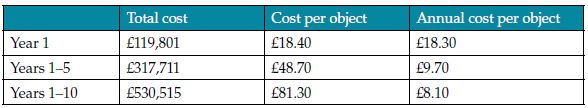 The key finding for this Case Study was that the costs for digital preservation did not vary greatly for differing quantities, as a largely automated process has been established. There were 6,526 objects harvested as part of the process for SHERPA-DP, giving the overall costs highlighted below.