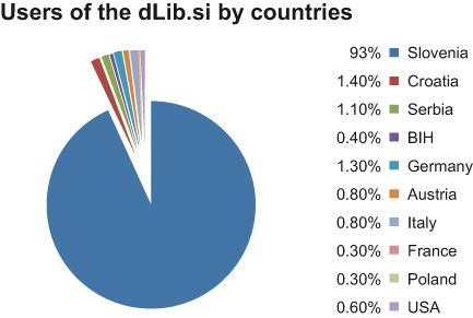 The target groups of users who access digital resources from the dLib.si do not differ from the target group that visits the library in person. Mostly they are students, researchers and other university staff, school children, and the professional and general public.[11] With the help of Google Analytics, which registers only searches made by actual users and ignores searches by web indexing robots, we measured more than 2.8 million visits to the dLib.si portal. The users of the portal were mostly from Slovenia, but also from other European countries and even from the United States of America (see Figure 2).