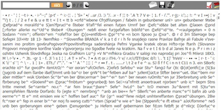 In documents published before 1850 (or sometimes even after this date), a very archaic type of Slovene was used.[16] OCR results of these documents are very poor indeed and the HTML previews are not only an unrecognizable mass of letters but contain numerous errors and strange signs, numbers instead of letters, spelling mistakes etc (see Figure 5). In such cases full-text search is disabled and further usage of the text is impossible.