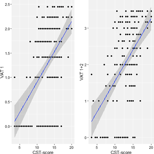 Hiërarchische multiple regressieanalyse liet zien dat een lineair model de relatie tussen CSt-scores en VAT-scores optimaal